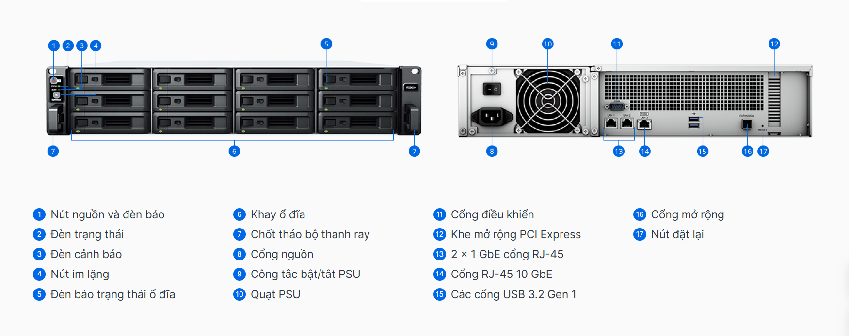 Bộ lưu trữ mạng Synology RS2423+ 12-bay Plus series, AMD Ryzen V1780B quad-core processor, 8GB DDR4 ECC (up to 32GB), 10GbE RJ-45, 2 x 1GbE ports, Support RX1223RP expansion, 3Y WTY